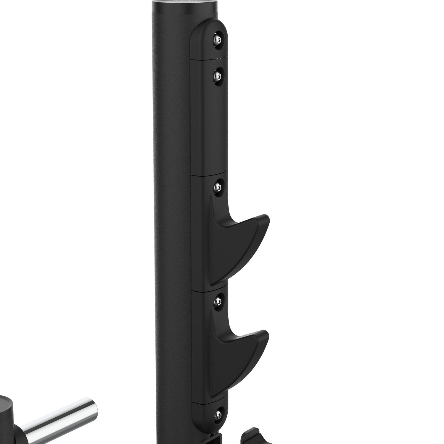 Los ganchos para barra están dispuestos en dos alturas distintas, lo que permite adaptarse a diferentes longitudes de brazos y estilos de levantamiento. El diseño corto de los ganchos reduce la distancia inicial al despegar la barra, haciendo el movimiento más fluido y seguro en cargas pesadas.