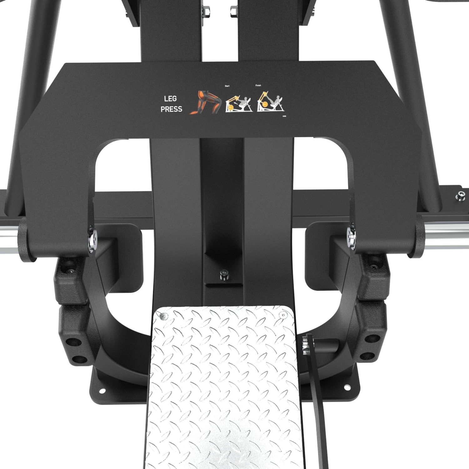 La prensa integra una plataforma sobredimensionada y antideslizante que permite variar el ancho y la altura de apoyo para dirigir el estímulo: posturas altas para enfatizar glúteos e isquios; posturas medias-bajas para priorizar cuádriceps; y apoyos más cerrados o abiertos para involucrar aductores con control. La superficie generosa evita límites artificiales del pie y habilita micro-ajustes milimétricos, clave cuando se buscan trayectorias consistentes entre series o se trabaja con usuarios de distintas longitudes de fémur y tibia.