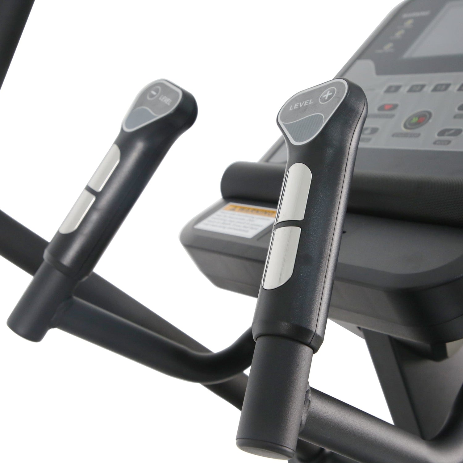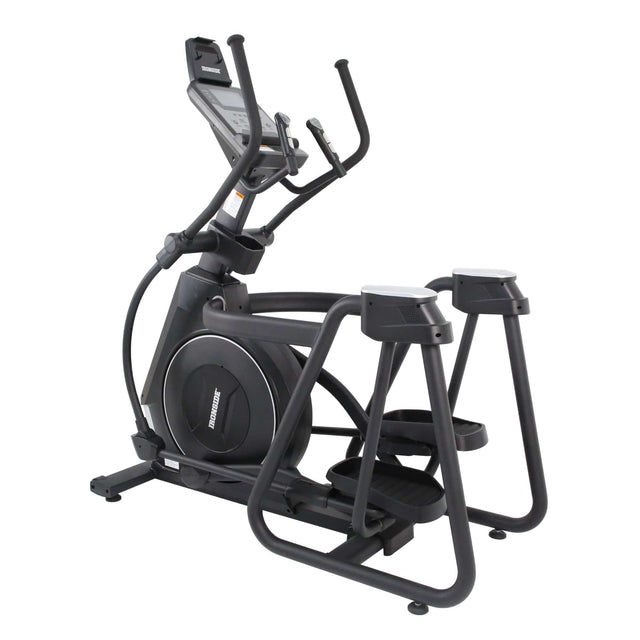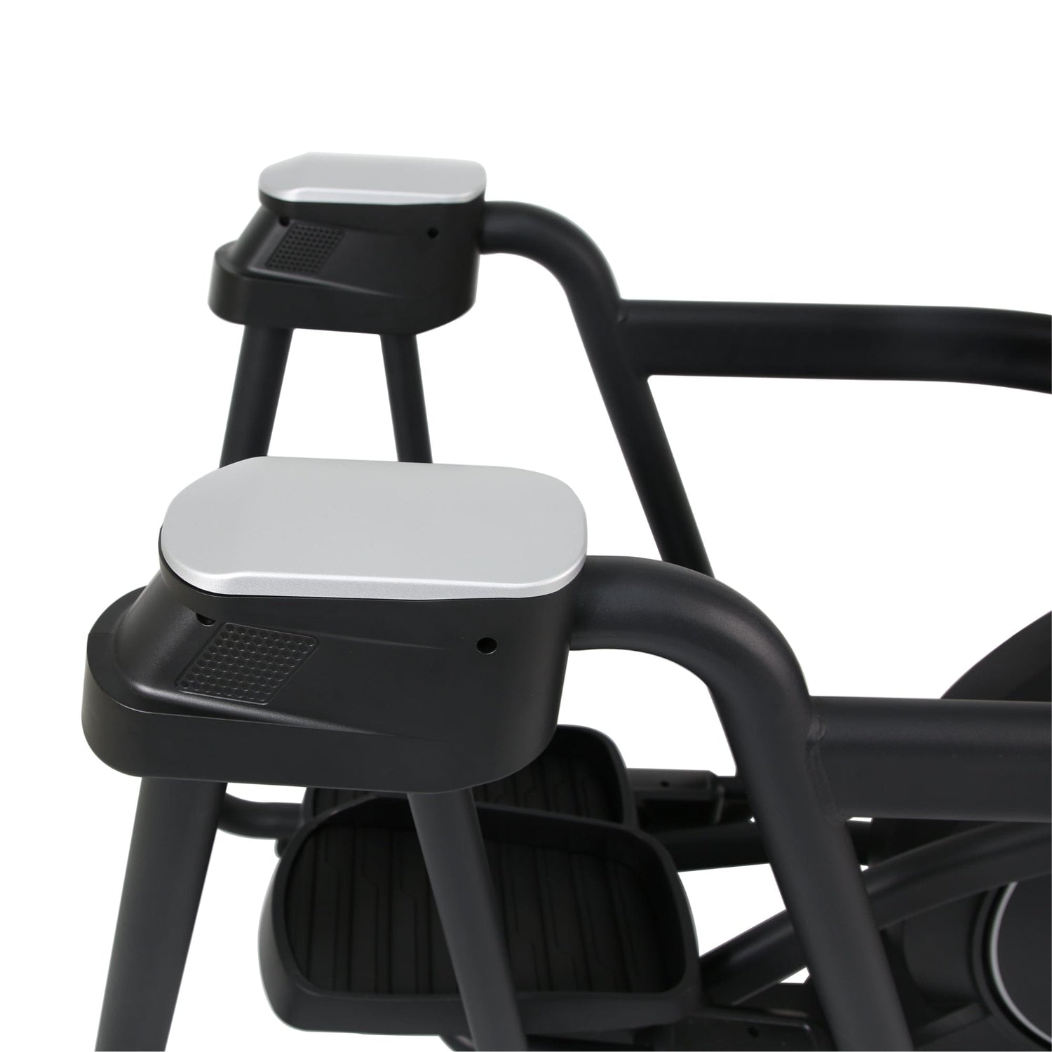 Con 105 kg netos, el chasis entrega aplomo real en cambios de ritmo, manteniendo alineación en usuarios de distintos perfiles. El acabado negro mate/sand resiste uso intensivo y conserva estética profesional en piso de cardio.