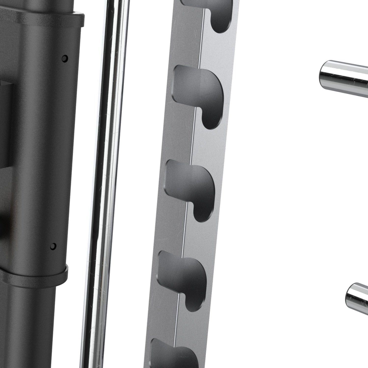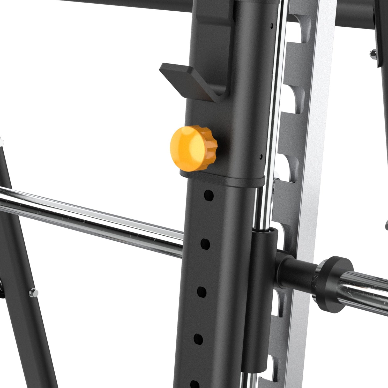 Los topes de seguridad de regulación rápida se fijan sin juego y con buena visibilidad, por lo que es sencillo definir una profundidad segura para atletas de distintas estaturas. La combinación de rodamientos autoalineables y guías rígidas brinda deslizamiento uniforme, eliminando tirones al despegar o al bloquear y permitiendo programar pausas isométricas sin que la barra se mueva.