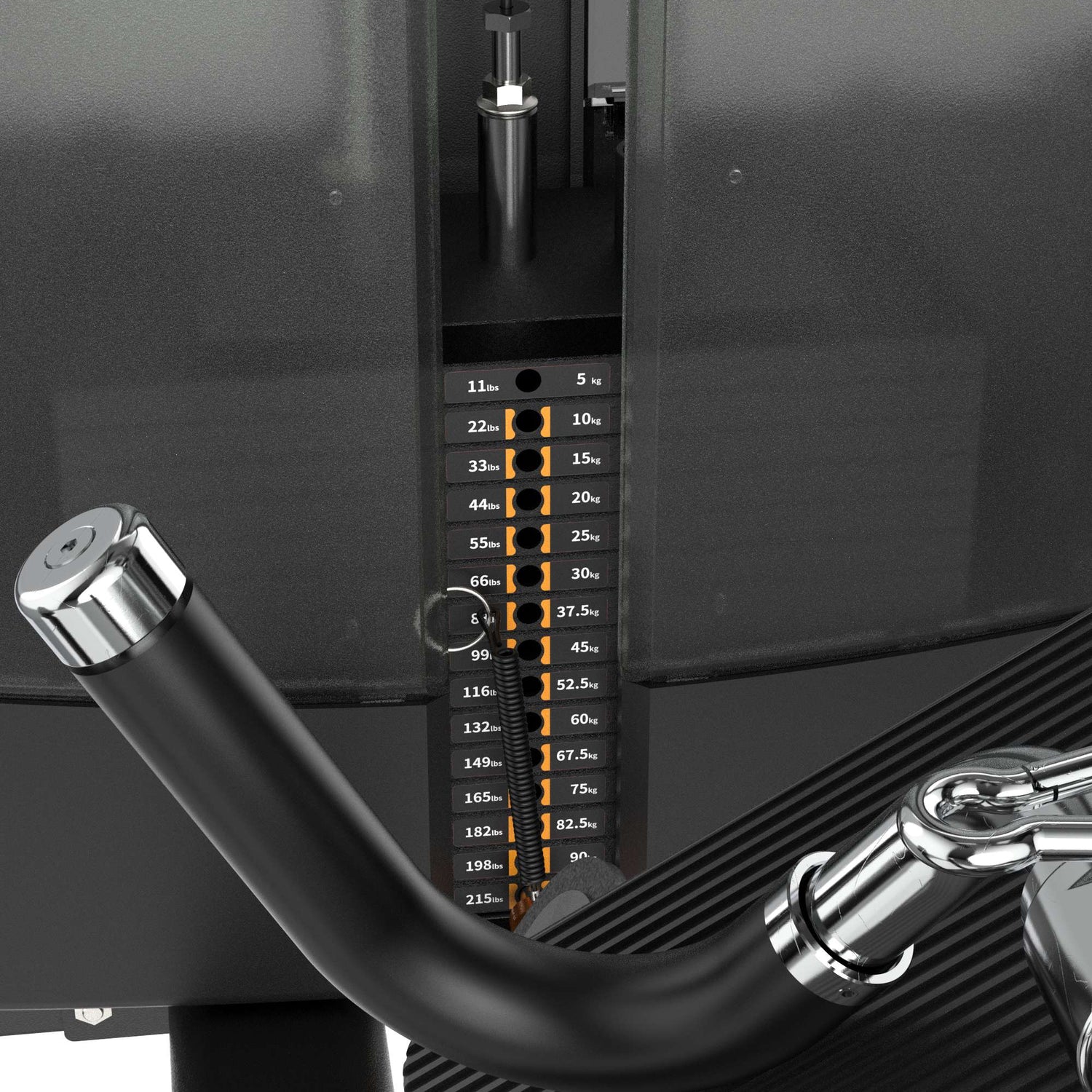 La pila de 105 kg con selector de pasador permite incrementos de 5 kg, facilitando la progresión lineal en fases de fuerza e hipertrofia. Cambiar la resistencia lleva menos de tres segundos, eliminando esperas y manteniendo el flujo de la rutina.